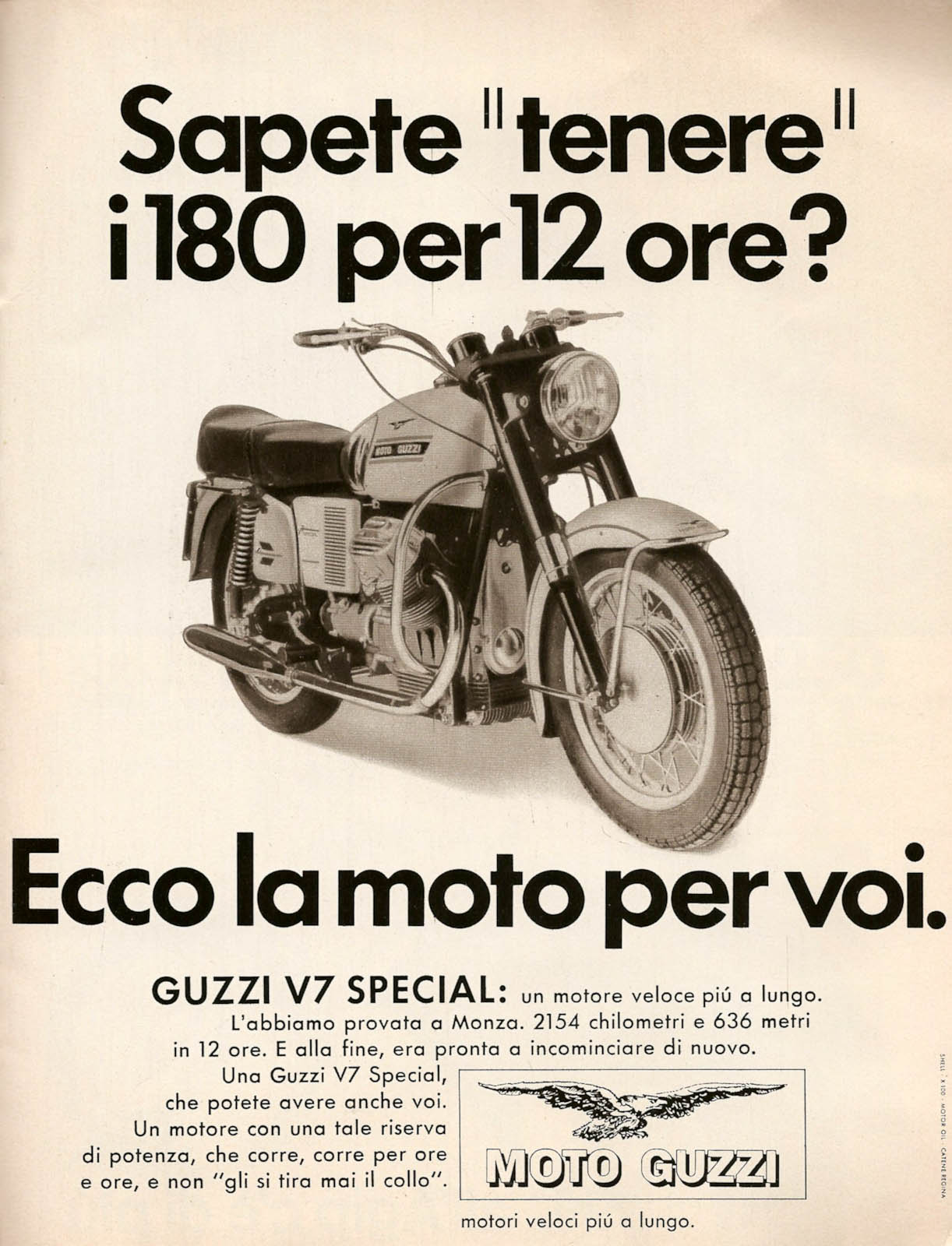 Nonostante fosse sostanzialmente una V7 migliorata, la nuova versione, battezzata V7 Special, apparve come una moto completamente nuova, grazie anche ad un’azzeccata verniciatura bianco/nera con filetti rossi e con zone cromate sul serbatoio, molto elegante e di efficace impatto estetico. L’aumento della potenza fu richiesto in modo particolare dagli importatori americani dove l’interesse per la V7 stava crescendo, negli Stati Uniti venne commercializzata con il nome di V7 Ambassador con differenti colorazioni e la leva del cambio spostata a sinistra.